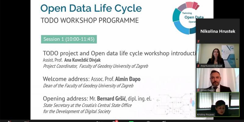The first session was opened by Project coordinator, Assist. Prof. Ana Kuveždić Divjak from Faculty of Geodesy University of Zagreb, who introduced the TODO project and agenda of the Workshop. Participants were welcomed by Assoc. Prof. Almin Đapo, Dean of the Faculty of Geodesy University of Zagreb, who is coordinating this EU project and was hosting the event. Recognising the role of the Central State Office for the Development of Digital Society and its direct connection with open data, the Workshop was formally opened by Ms. Kristina Posavec, deputy of the State Secretary of this office at Croatia’s Central State Office for the Development of Digital Society.